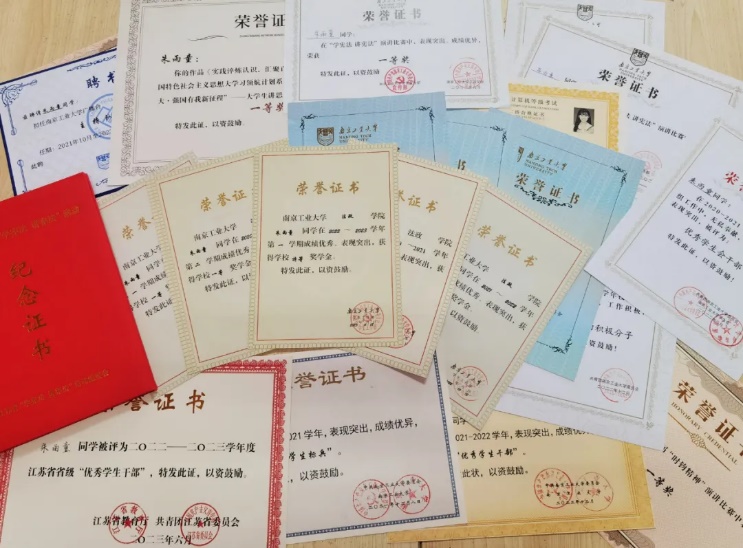 长此以往,朱雨童在本科三年的学习期间,在学业上取得了较为可人的成绩,顺利地一次性高分通过英语四、六级考试,考取了全国计算机二级证书,专业排名位居第一。在各项竞赛方面,朱雨童获得了例如“外教社·词达人杯”全国大学生英语词汇能力大赛并全国二等奖、江苏省特等奖、LSCAT江苏省笔译大赛三等奖、校“学宪法 讲宪法”演讲比赛一等奖等奖项。“你不是笨蛋,你只是比其他人花更多时间成功而已”,兴许是这句被她写在高三奋斗榜的话,又或是心中一直燃烧的闯劲,朱雨童一直努力将每件小事做好做实,才成就了现在这样积极上进的她。